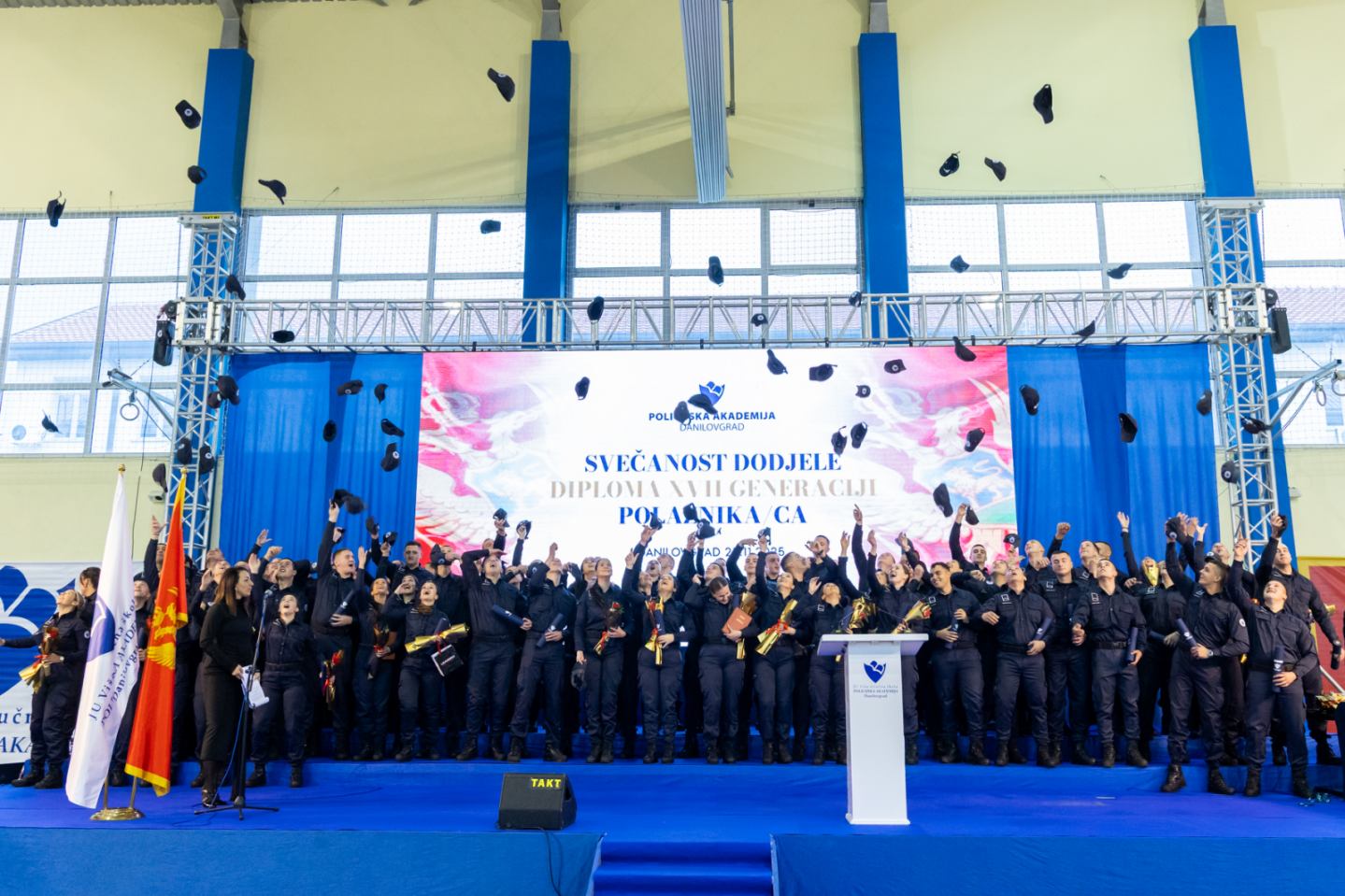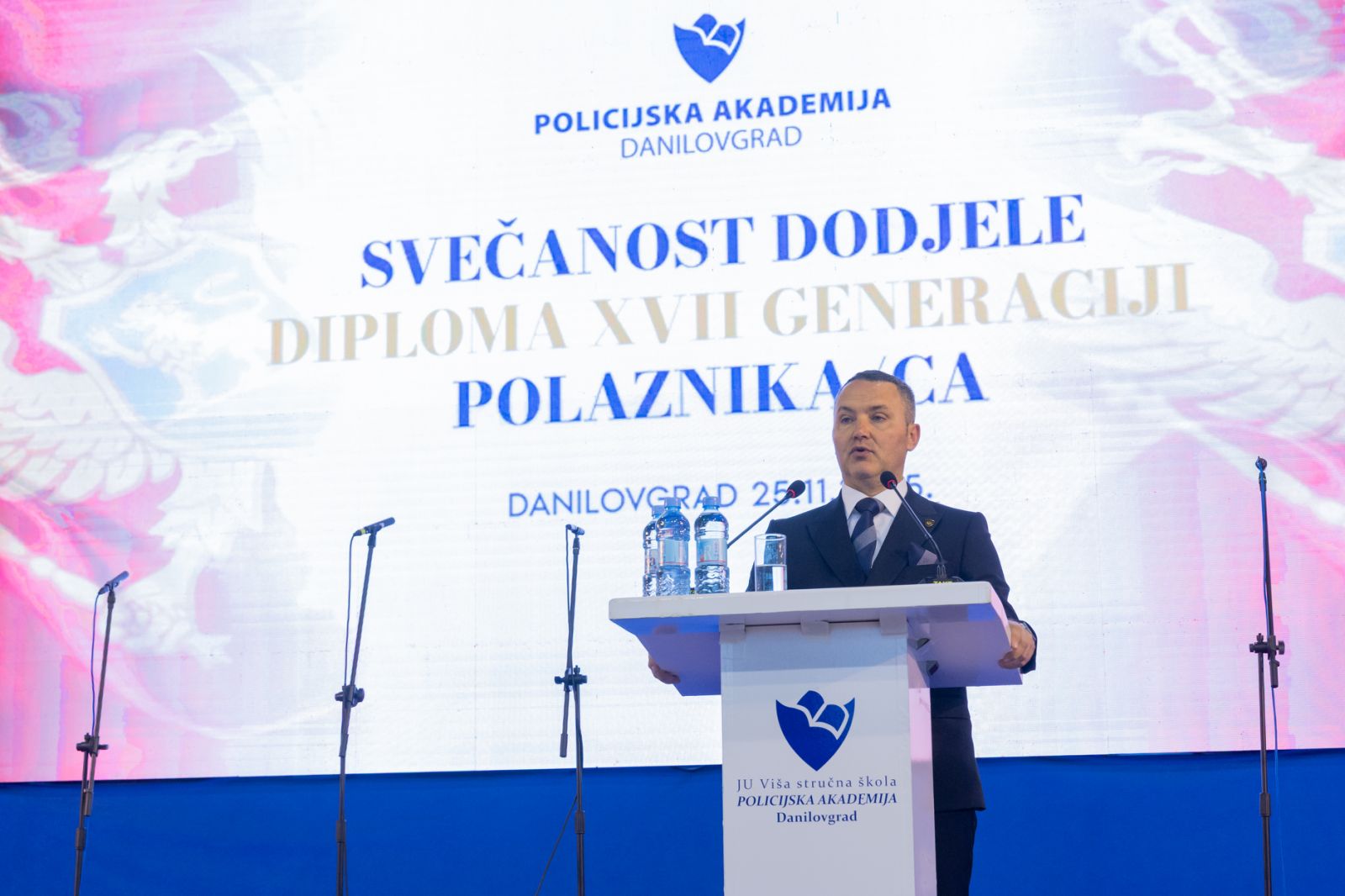 Na Policijskoj akademiji u Danilovgradu danas je, uz prisustvo brojnih državnih zvaničnika, ambasadora, predstavnika međunarodne zajednice, roditelja i porodica polaznika, održana ceremonija dodjele diploma polaznicima XVII generacije. Svečanosti su prisustvovali i potpredsjednik Vlade za bezbjednost, odbranu i unutrašnju politiku Aleksa Bečić, ministarka prosvjete, nauke i inovacija Anđela Jakšić-Stojanović, kao i rukovodstvo i zaposleni Policijske akademije.